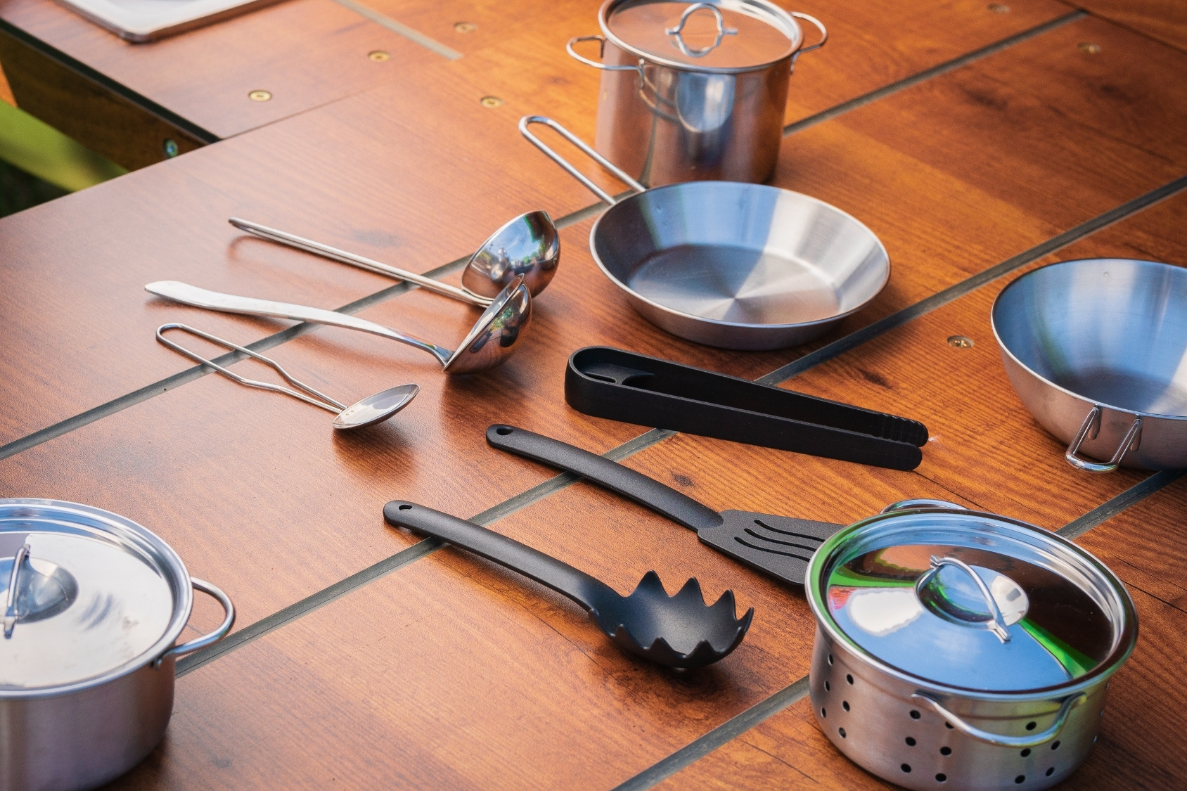 • A set of mini dishes, pots, and pans made of stainless steel