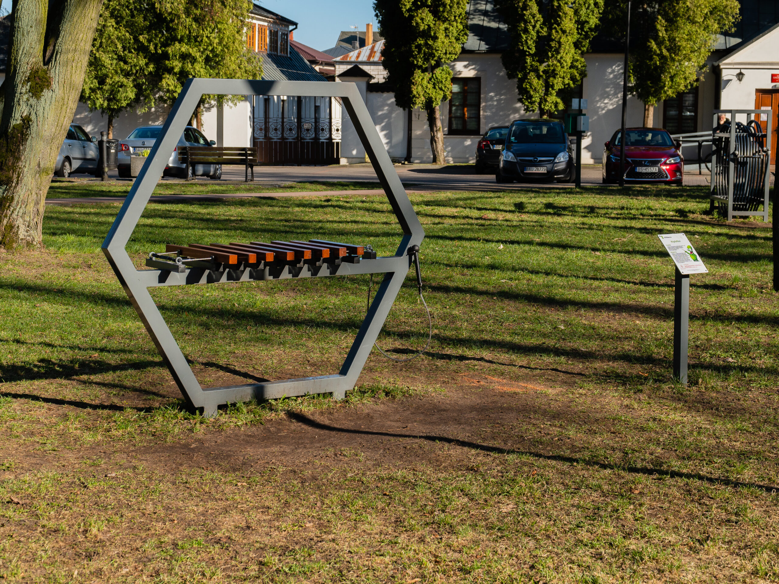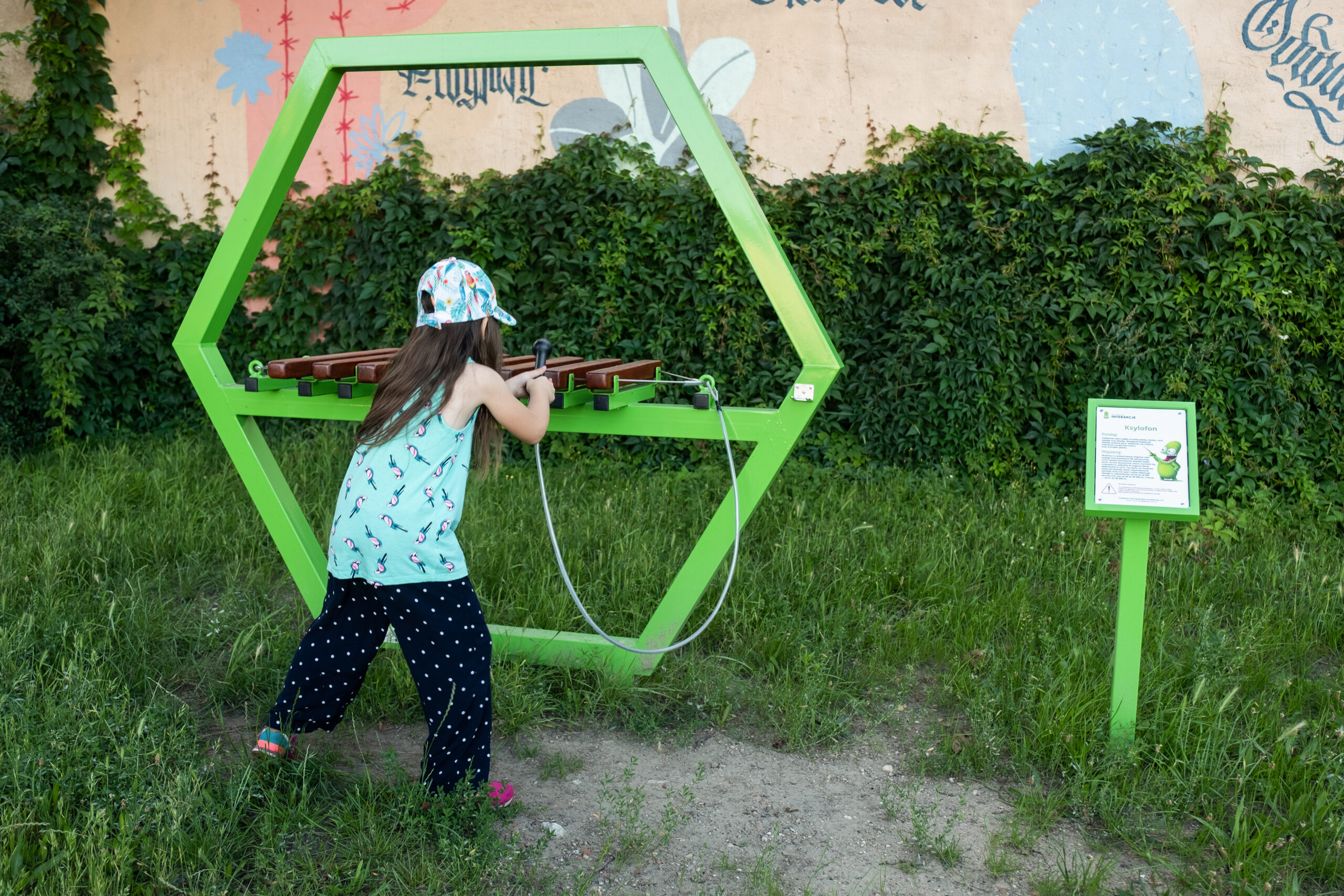 Strike a bar with the mallet. Each bar produces a different sound. Explore how the sound changes depending on where you strike the bar. Here we can observe the vibration of a solid body and the creation of a sound wave.