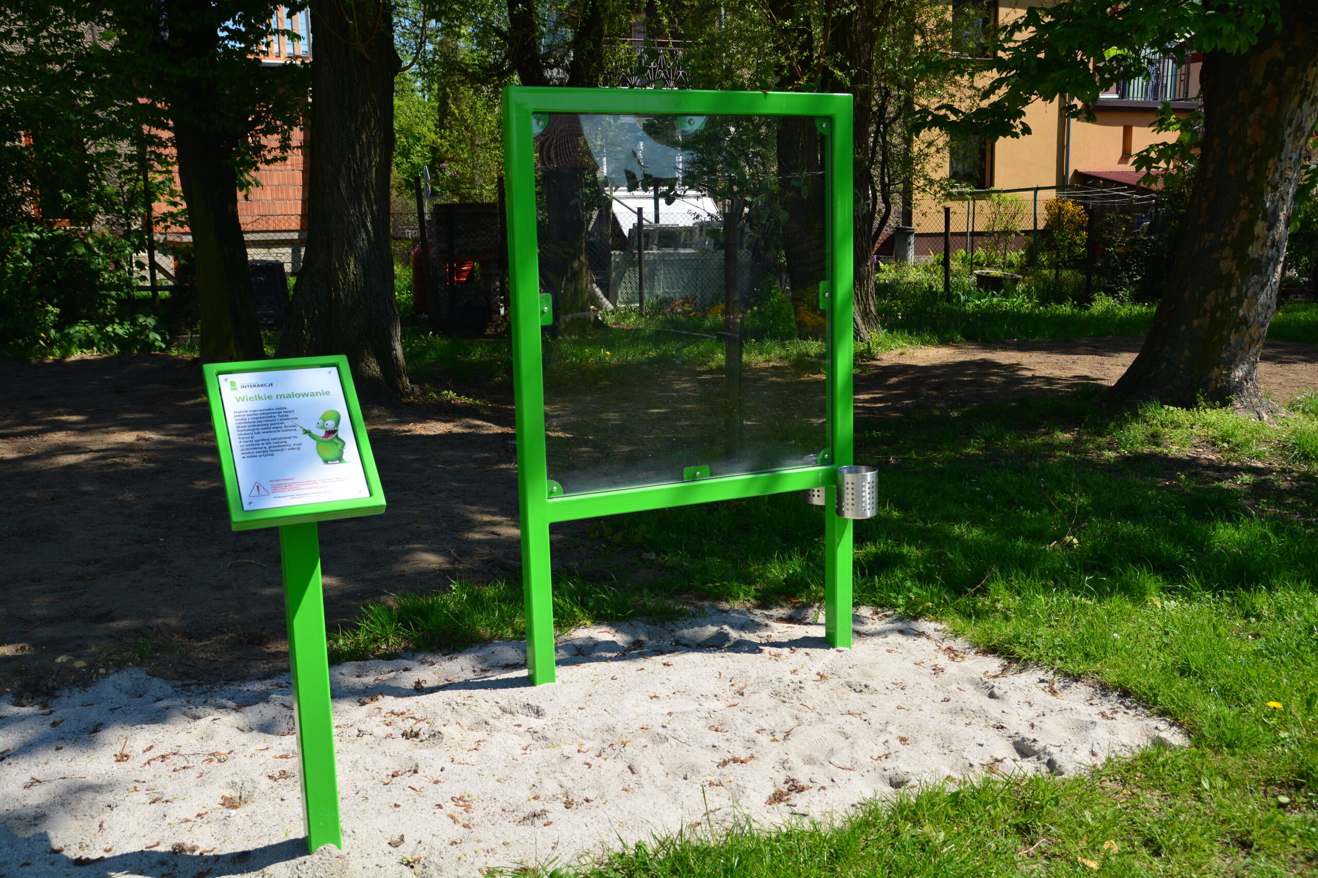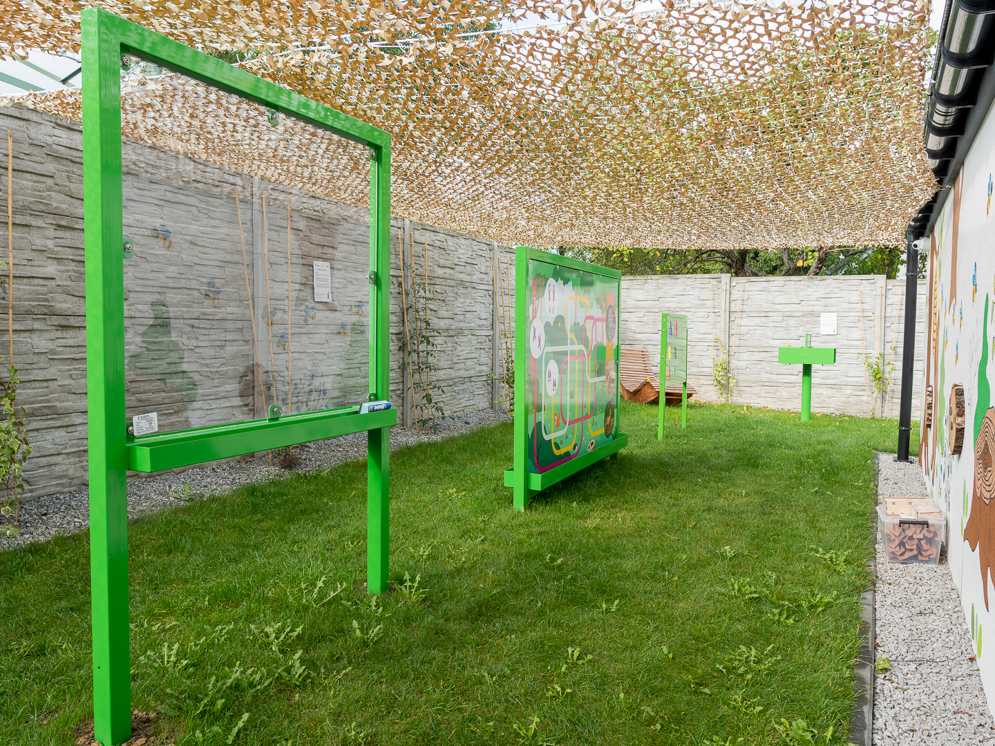 This all-year-round garden painting wall is a sensory device that develops various skills: precision, fine motor skills, sensitivity, a sense of aesthetics, and awareness of the surrounding landscape. Thanks to its size and transparent construction, it also fosters cooperation in groups and helps build social bonds. From now on, the playground can become an inspiring place for nurturing creativity and imagination!